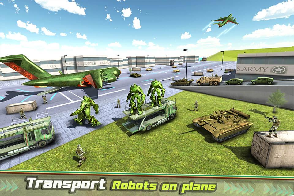 Bienvenido al Juego de Transporte del Ejército de EE. UU. - Tanque de Transformación de Robots en el que volarías un avión del ejército y transportarías cargas militares y tanques del ejército para misiones de transformación de robots del ejército. A diferencia de otros juegos de Transporte del Ejército de los EE. UU., Este simulador de transporte del ejército lo convierte en un agente de manejo de tanques de batalla, así como en un transportador de avión que puede llevar a cabo el transporte de un robot tanque. Combinando las habilidades involucradas en los juegos de transformación de robots con la estrategia involucrada en el simulador militar de EE. UU. Para el transporte de tanques militares, este juego de transporte de robots lleva la experiencia en lo mejor de los juegos del ejército estadounidense a un nivel completamente nuevo. Adéntrate en la acción a través del simulador del ejército de EE. UU. Con conducción de camiones de transporte robotizado, aviones de carga del ejército volando y acción transformadora de robots en una isla secreta, para que los enemigos no se enteren. Todo esto hace que los juegos de aviones del ejército califiquen para los mejores juegos de ejército que compiten bien con juegos de robots similares. Tienes que volar aviones del ejército, conducir tanques del ejército y camiones transportadores y transportar robots transformar tanques en un solo lugar, por lo que es una combinación perfecta de juegos de tanques del ejército y juegos de transporte de aviones del ejército para los fanáticos del transporte del ejército. Lo bueno de este robot simulador de transporte militar es que combina la diversión de los juegos de transformación de robots y los juegos de transporte del ejército en un solo juego de conducción militar. Conduce el tanque del ejército en un camión de transporte y vuela un avión de carga del ejército a la base militar de EE. UU. Para obtener la mejor acción transformadora de los juegos de robots. Ningún juego de transformación de robots o juegos de robots te darán el placer de los juegos de transportes militares.