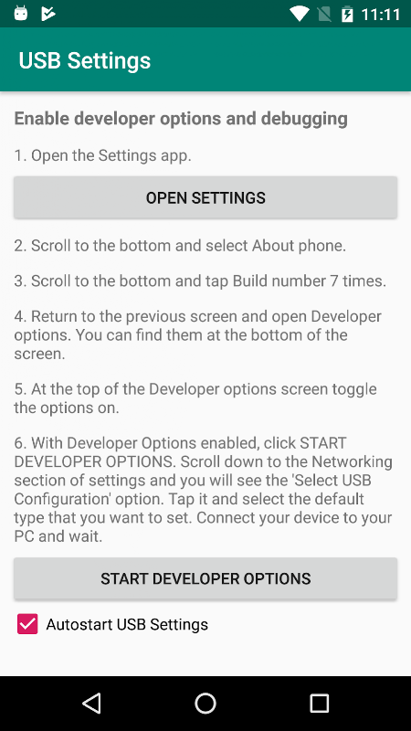 Esta aplicación abre la configuración de la conexión USB, para que pueda activar MTP o PTP.