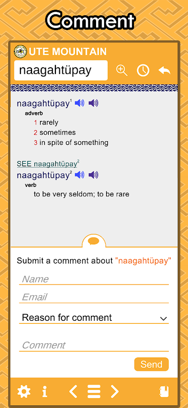 • Hay dos caras del Diccionario Ute Mobile. Si actualmente está viendo una palabra Ute, está en el lado "Ute". Los botones izquierdo y derecho lo llevarán a la palabra Ute siguiente o anterior en orden alfabético. Al tocar el botón Hamburguesa, obtendrá una lista de las palabras alfabéticas más cercanas a la entrada que está viendo actualmente.