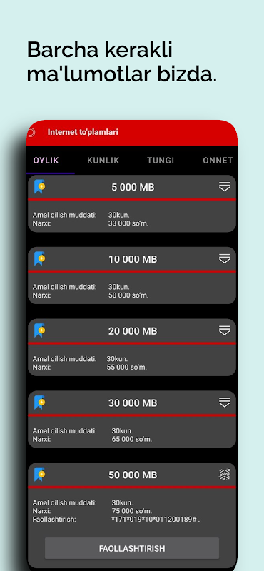 Internet to'plamlar(oylik,kunlik,onnet,tungi,5G)