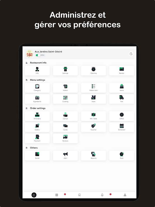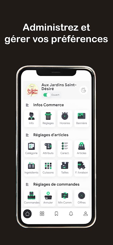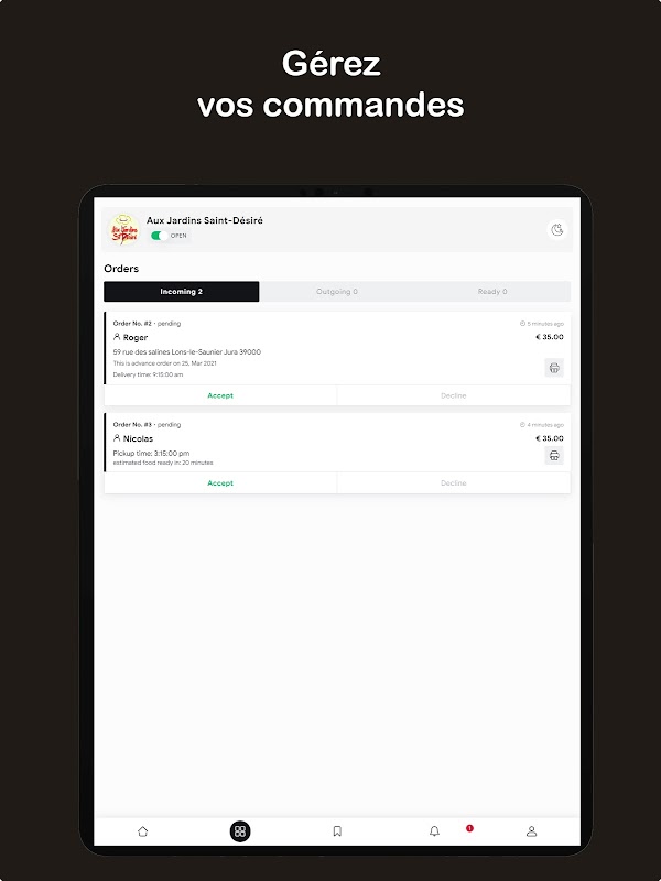 Grâce à cette application, il est possible de gérer l'ensemble des commandes en temps réel (Commandes, click & collect, passage, téléphone ou digital), de modifier les articles existants et d'en rajouter de nouveaux, pour manager les commandes et les valider ou les refuser.