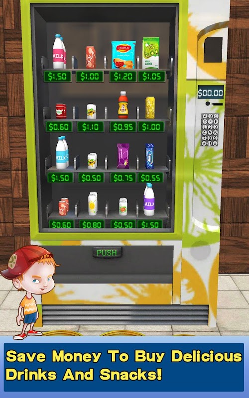 Aprendizaje y diversión. Qué más quieres. En este juego de máquina expendedora se pueden comprar bocadillos, bebidas y los huevos especiales. Usa el dinero correctamente y recoger todos los objetos de colección.
