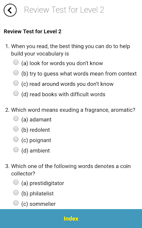 Se procederá a través de diez niveles de vocabulario, cada nivel más difícil que el anterior. Por ejemplo, el nivel 1 contiene palabras familiares a aproximadamente 60 a 70 por ciento de los adultos, es decir, palabras conocidas a muchos graduados de secundaria y la mayoría de los graduados universitarios. A finales de nivel 5 se le han planteado a su vocabulario sobre el percentil-el 75º cuarto más alto de todos los adultos educados. A finales de Nivel 8 su vocabulario se habrá superado a la de la mayoría de los ejecutivos y profesionales, incluyendo aquellos con grados avanzados. Y cuando se completa el nivel décima y última se le han progresado más allá del 95 por ciento de toda la población. Que estará al mando de un arsenal de palabras que sólo un puñado de personas de cada mil puede igualar.