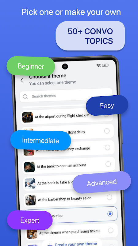 Controla tus rachas y el avance por temas para mantener la motivación. Diseñada para quienes desean practicar inglés gratis, mejorar su habla o unirse a un curso online de conversación.