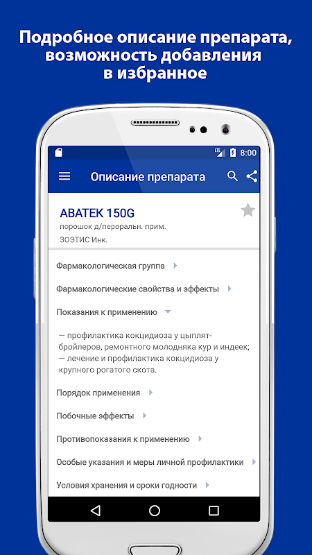 La descripción de cada producto incluye información sobre el comercio y el nombre internacional, la composición y la forma de propiedades farmacológicas (biológicos) y efectos, indicaciones y el procedimiento para su uso en animales de los diferentes grupos, los efectos secundarios, contraindicaciones para el uso de instrucciones especiales, medidas de profilaxis personal, condiciones de almacenamiento y fechas de vencimiento