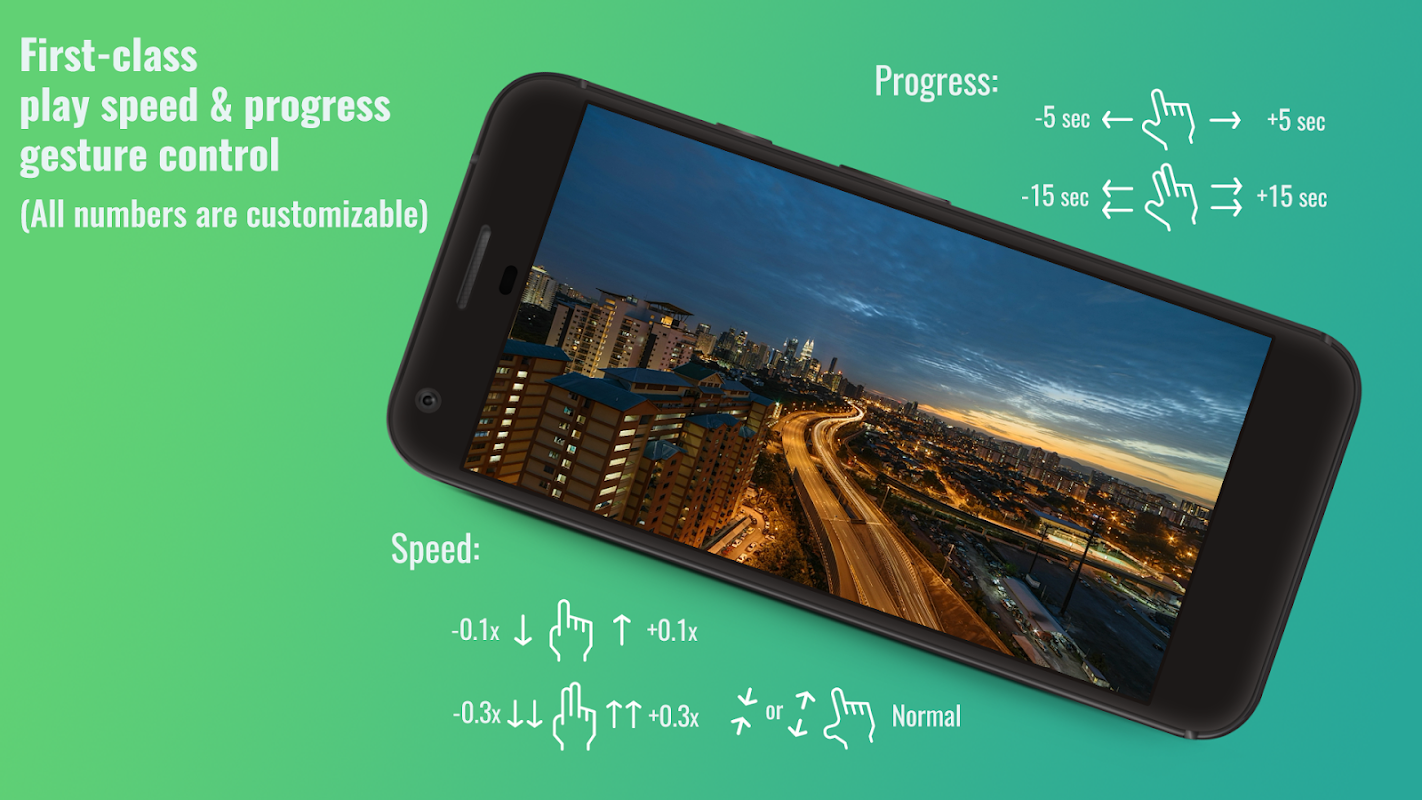 Fine-grained speed changing, forward and rewind gesture control, and all numbers are customizable.