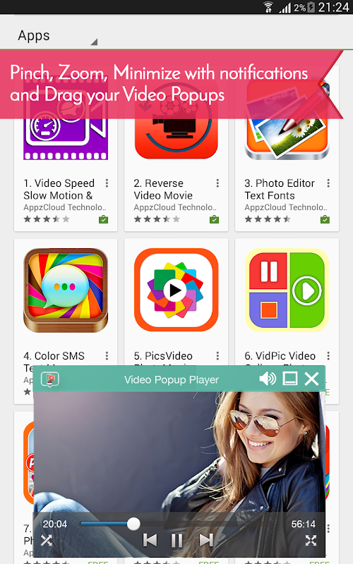 Flotante reproductor de vídeo con popup es clase aparte y tiene características innovadoras. Usted puede hacer multitarea real. Flotar uno o más vídeos en la parte superior de otras aplicaciones como SMS, correo electrónico, mapas, navegación, etc. Siga haciendo su trabajo, y al mismo tiempo viendo una película en la ventana emergente. Usted puede incluso cambiar el tamaño (pinch / zoom) su pop-ups de vídeo y mucho más ...