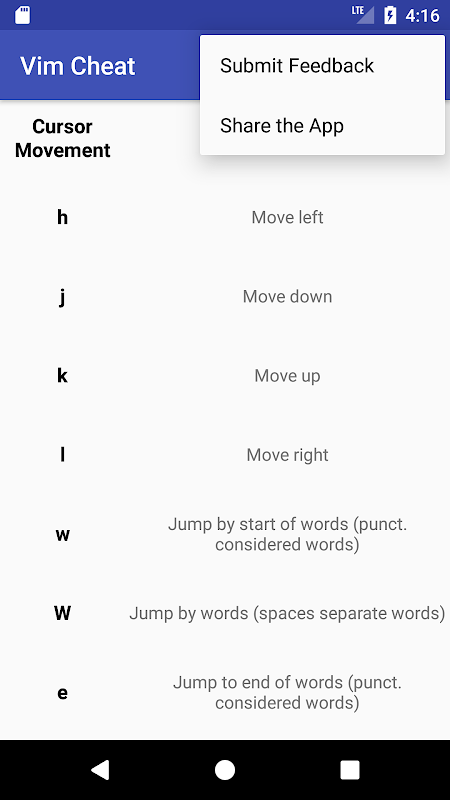 This app lists all the commands and a description of them to give you easy access to all of Vim's keyboard shortcuts to help speed your editing up!
