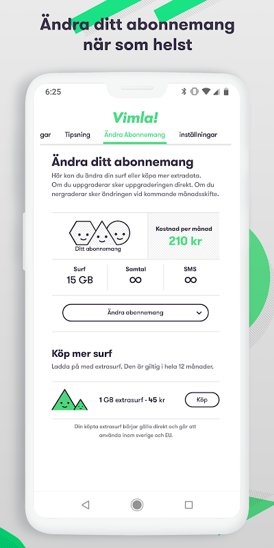 En Vimla queremos hacer telefonía móvil de una manera diferente. Con buena oferta y condiciones dignas. ¡Por supuesto, esto también se nota cuando usas nuestra aplicación! Único en Vimla es que puede hacer lo siguiente directamente en la aplicación: