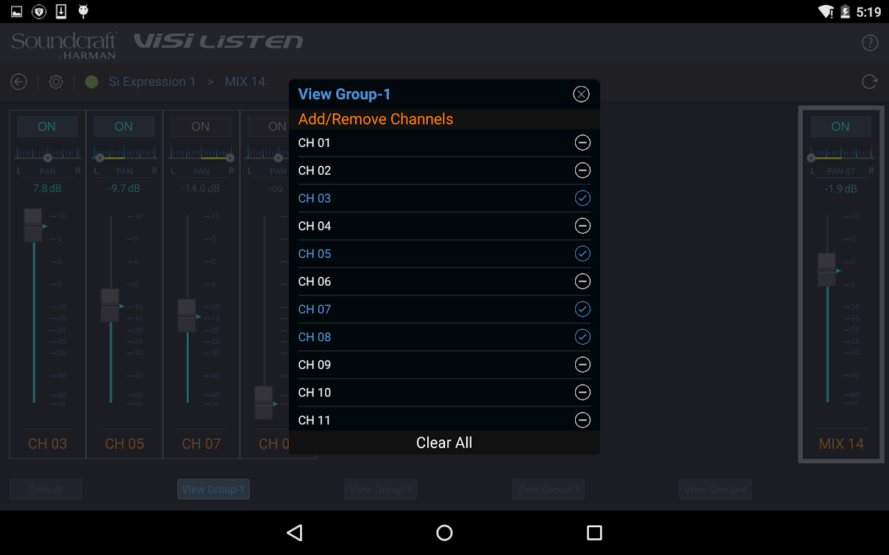 Soundcraft ViSi Escuchar es una aplicación para Android que permite el control remoto de los niveles de contribución del bus de mezcla de Si de impacto, Si Artista, Expresión Si y Si Compact consolas de mezcla de forma inalámbrica. Conectar su dispositivo Android a un router de acceso inalámbrico que se conecta al puerto Ethernet Harman HiQnet® de la consola.