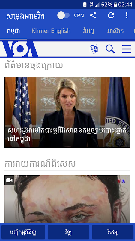 News of Cambodia, World News, American News, Cambodian News, Khmer News, Learning English by VOA, Culture & Life News, Arts News, Economic News, Sports News, Knowledge News, Tables, Live Broadcast , TV shows, videos, special reports, All Topics, Human Rights News, Khmer Rouge, Environment News, Science & Technology News, Health News, Education News and ....
