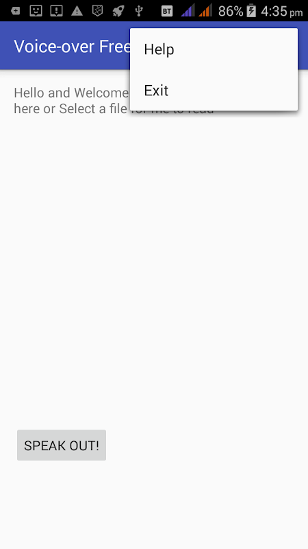 Voice-Over-Free is a Text to Voice Converter app that will read aloud any text file on your device. It can read out from a PDF file with the help of a built in text extractor. No need to type. Read aloud text or pdf file on your device. File selector enable you to select the file to read.