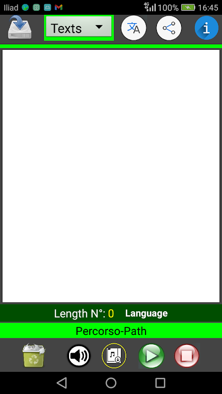 Puede crear un archivo de audio.wav del texto, después de escucharlo con el botón del altavoz y guardarlo con el botón siguiente (flecha que apunta hacia abajo con la nota musical), puede volver a escucharlo, pausarlo y detenerlo. con los botones de play y stop.