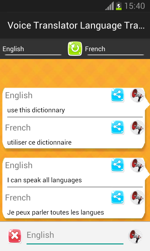 With Voice Translator Language Dictionary what you guys say gets translated into another language, all voice to voice.