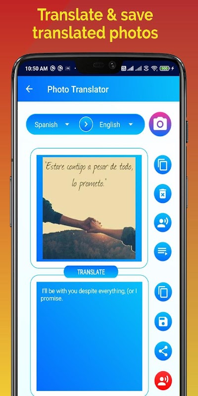 - Grabar, guardar, traducir y escuchar la voz traducida en todos los idiomas.