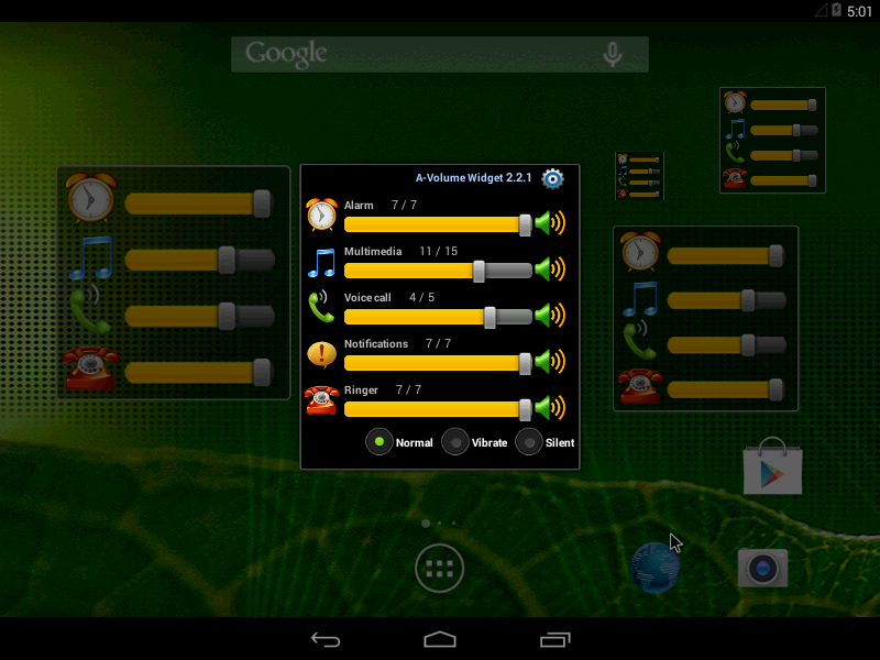 "A-Volume Widget" permite ver al instante en tu escritorio y rápidamente ajustar los niveles de volumen de corriente de alarma, reproductor multimedia, llamada de voz, de timbre y las notificaciones del sistema. Elemento muestra los niveles de volumen actuales, independientemente de la forma en que fueron creados. El mínimo tamaño de widget es sólo 1х1. Widget es de tamaño variable - usted puede aumentar su tamaño si lo desea (para Android 3.1 + solamente Largo toque en el widget y cambiar su tamaño!).