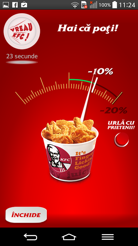 Descarca aplicatia si urla cat poti de tare, singur sau cu prietenii si poti primi un discount de 10% sau chiar 20% ca sa-ti potolesti pofta la KFC.