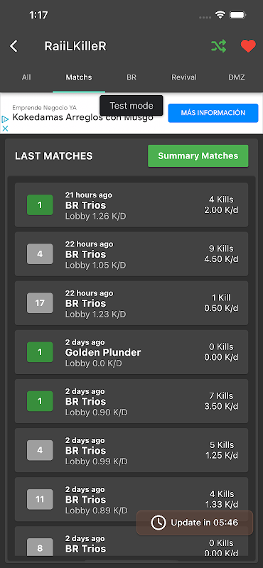 Aparte de visualizar tus últimas partidas jugadas, podrás ver tus estadísticas de cada modo de juego, MODO BR, MODO RESURGIMIENTO, MODO BOTÍN.