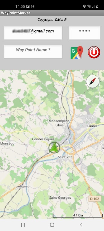 Application de cartographie qui permet de marquer des points particuliers et d'envoyer leurs coordonnées GPS par mail accompagnées d'un commentaire.