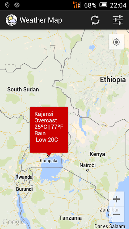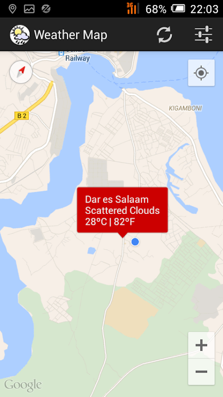 With Weather MAP,you will be able to view weather status of your location and nearest ones via google maps. To get weather update at a particular location just press and hold that location on the Map via your device screen.