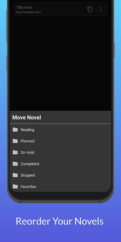 • Reorganizar sus carpetas y Web Novels en su biblioteca es muy fácil. Puede editar, reordenar y eliminar elementos. Además, puede mover Web Novels a otra carpeta. Por ejemplo, una vez que haya terminado de leer una novela web, puede moverla de su carpeta Leyendo a su carpeta Completado.