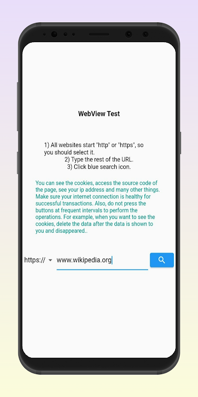 Probar sitios web en formato WebView: Introduzca cualquier URL y visualice el sitio web en formato WebView.