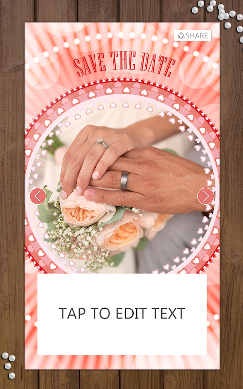 Si usted quiere tener invitaciones de boda moderna, enviarlos electrónicamente! Ahorrar dinero y en vez de gastarlo en un poco de papel de lujo guardarlo para otra cosa! Puede crear hermosas tarjetas postales gratis con este fabricante de la tarjeta de invitación de la boda! Escribir una nota especial sobre cada invitación y personalizar el texto, cambiar las fuentes y colores de texto! Tendrá increíbles tarjetas personalizadas con Invitación De La Boda! Guardarlos, compartirlos en línea o enviar a cada uno personalmente a sus invitados! Usted puede hacer todo esto desde la aplicación! Pruébalo ahora y ver por sí mismo!