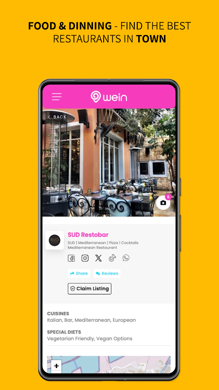 Wein es una aplicación móvil innovadora todo en uno preparada para redefinir la visibilidad y el alcance de los clientes en el Líbano. Como guía y directorio completo, conecta a los usuarios con una amplia gama de servicios y eventos, desde restaurantes y farmacias hasta escuelas, autónomos y personas que ofrecen diversos servicios.
