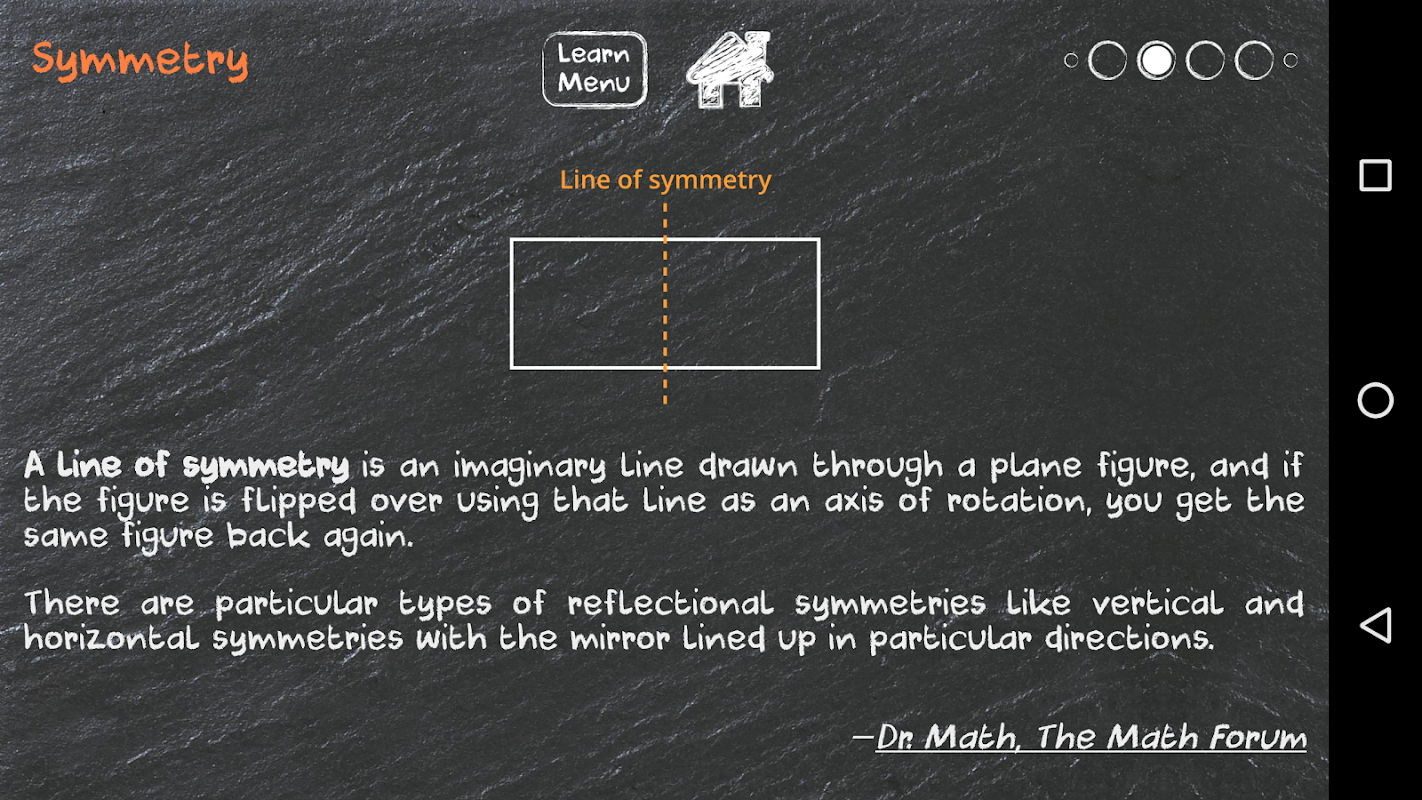 - 7 different geometry topics to play and learn: polygons, 3D shapes, circles, symmetry, vertices, lines and angles