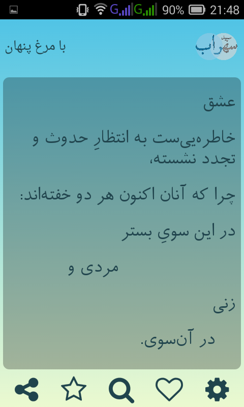 اشتراک گذاری : با کمک این امکان شما می توانید لذت خواندن اشعار را با دوستان خود به اشتراک بگذارید. قابلیت اشتراک گذاری این برنامه بصورت عکس و متن یا هر دو حالت می باشد و تمامی شبکه ها و برنامه های ارتباطی و اجتماعی نظیر فیسبوک، اینستاگرام، تلگرام، واتساپ، توییتر یا ارسال بصورت پیامک و ایمیل ... را پشتیبانی می کند .