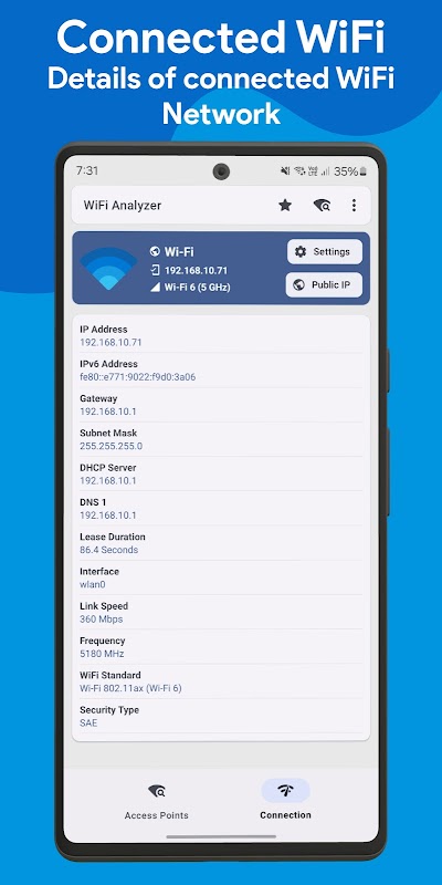 El analizador de WiFi no solo escanea las redes cercanas sino que también proporciona información detallada sobre su red conectada. Puede ver la configuración IP de su dispositivo y la segmentación de la red, incluida la dirección IP y la máscara de subred, el punto de acceso principal y los detalles del servidor DHCP, los servidores DNS, el tiempo de concesión de IP, la interfaz conectada y la velocidad del enlace.