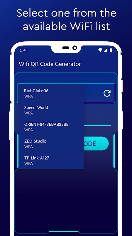 Con un diseño hermoso y futurista, el lector de códigos QR de WiFi le permite conectarse fácilmente a una red WiFi escaneando un código QR generado previamente. Simplemente coloque su cámara móvil en el código QR y automáticamente la aplicación se conectará a la red escaneada.