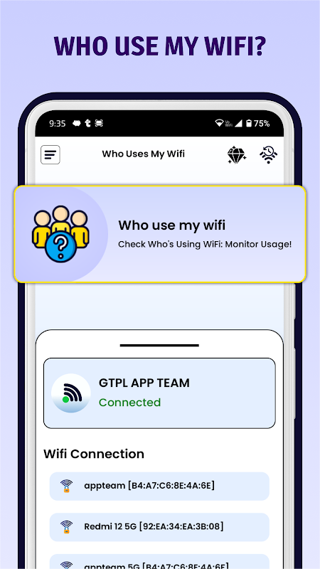 Descubre fácilmente quién usa mi WiFi con una lista completa de usuarios WiFi. Nuestro preciso detector de WiFi, que utiliza la función "Mi WiFi", garantiza que ningún dispositivo conectado pase desapercibido.