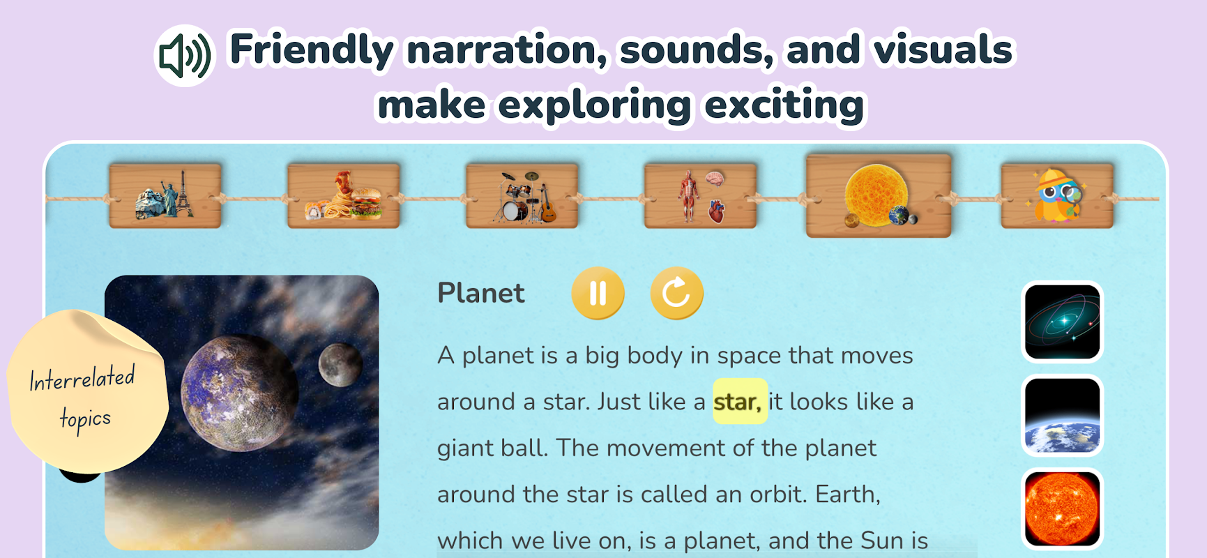 Cada una de las 192 entradas está cuidadosamente elaborada para niños pequeños y acompañada de imágenes, narración amigable (hasta 30 segundos por entrada), texto y sonidos.