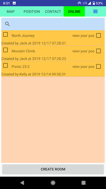 Share your realtime locationby making a room with all members you want. Then share your GPS position to that room. If click to that room, you could see all of members's location.