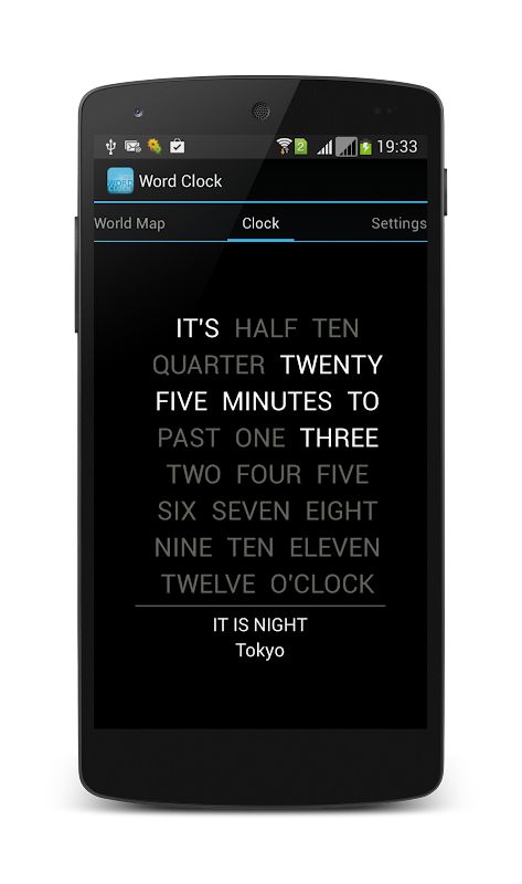 Verbal Word Clock o reloj - es el tamaño de cuatro widgets que constantemente puede mostrar el tiempo en una presentación oral en la pantalla de su teléfono en diferentes idiomas (Ukr, Ing, Esp, Spa, Ger.....). También puede ejecutar el programa Word Clock. El reloj de la Palabra tiene la posibilidad de añadir una representación voz del tiempo, la pantalla de zona horaria, tradicional hora símbolos del día (en Inglés, ruso, chino, europeo), cambiar el esquema de color y mostrar el tiempo y el tiempo en diferentes ciudades en el mapa mundial.