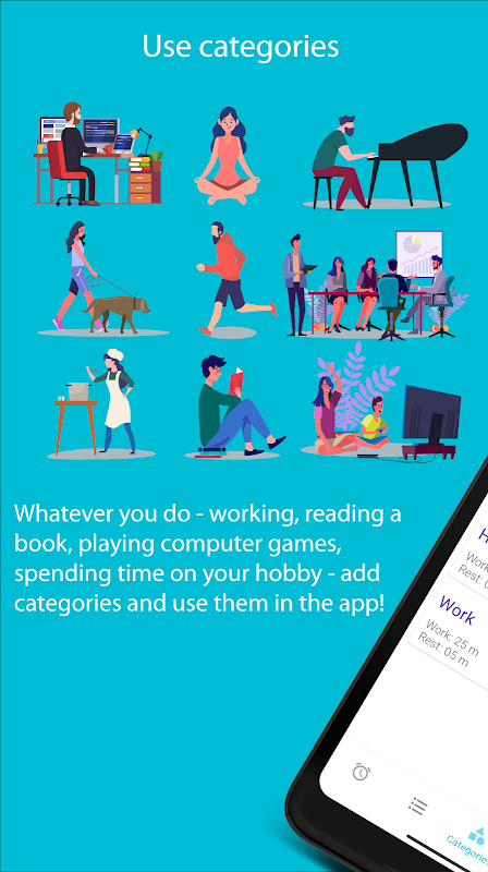 📊 Cada categoría tiene sus propias estadísticas, configuración de períodos de trabajo / descanso, color de categoría.