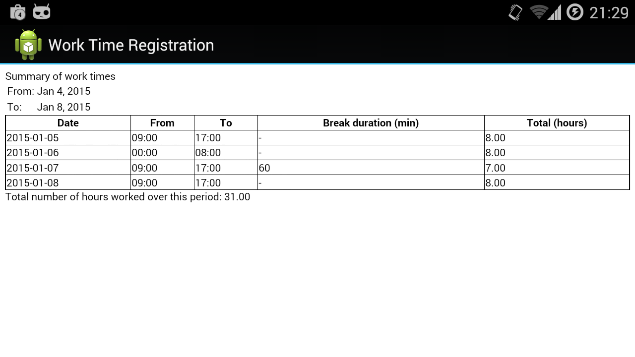 Esta aplicación se encargará de su registro del tiempo de trabajo. Guarde las veces que ha trabajado y chequearlos en un buen resumen de aspecto. Filtrar sus tiempos de trabajo con fecha de inicio y final y ver cuántas horas has trabajado ese período. Exportarlos en un formato HTML fácil imprimible!