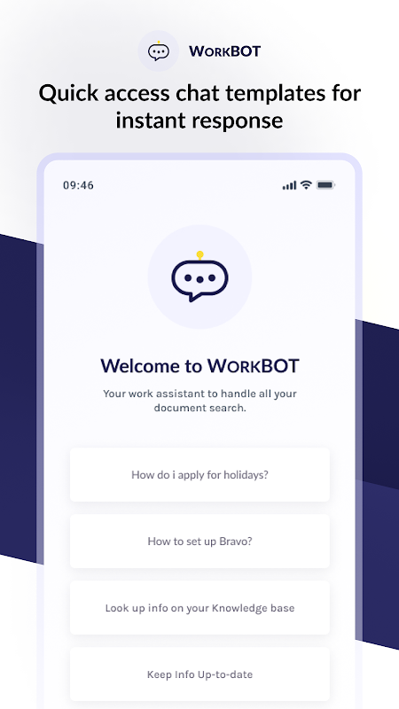 Potencie sus datos con la aplicación móvil WorkBot, un chatbot de IA conversacional intuitivo que comprende, aprende y toma medidas prácticas, revolucionando la forma en que administra y accede a información vital dentro de su organización.