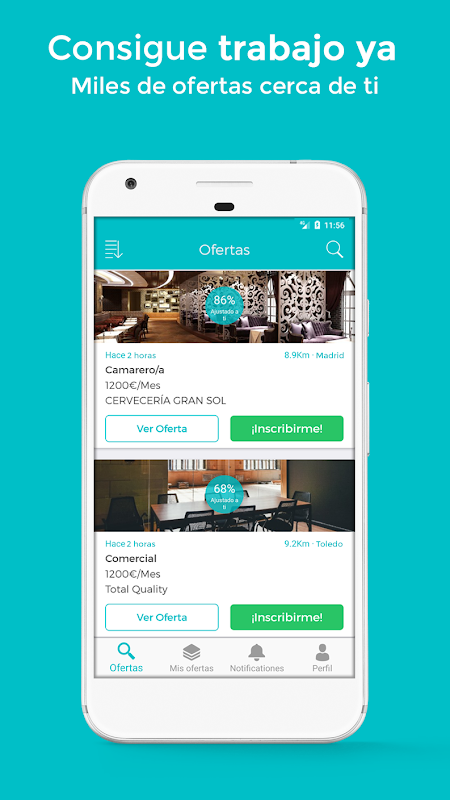 Ponemos a tu disposición más de 30.000 ofertas de trabajo y ¡subiendo cada día! En un solo clic, encuentras en tu móvil de todo tipo de puestos en Hostelería y Turismo, Comercio, Eventos, Construcción, Logística y Transporte y Ocio.