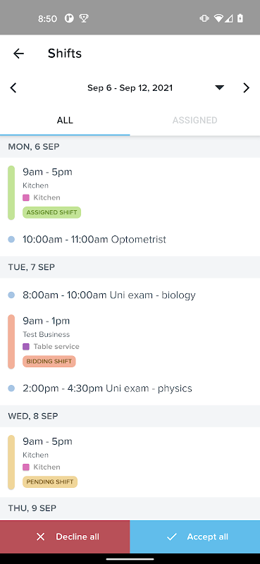 - Gestión de la lista: vea los próximos turnos, acepte, rechace y / o intercambie turnos con otros empleados. Haga una oferta en los turnos abiertos sobre la base del primero en entrar, el mejor vestido. Notifique a su gerente de cualquier indisponibilidad ad hoc o recurrente para que la lista se actualice en consecuencia.