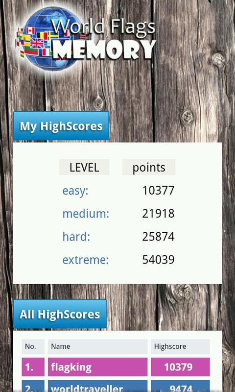 A high score table shows your points for every level and you can also submit your score to the online high score list and compete withe players all over the world. This makes the World Flags Memory Game a fun challenge!