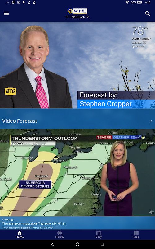 El jefe de meteorología Stephen Cropper y Severe Weather Team 11 impulsan la mejor herramienta meteorológica de Pittsburgh. La aplicación WPXI Severe Weather 11 te brinda todo lo que necesitas para estar al tanto de las condiciones climáticas que cambian constantemente en el oeste de Pennsylvania. Esta aplicación gratuita 24/7 no solo ofrece el pronóstico más preciso de Pittsburgh, sino que también permite a los usuarios interactuar con muchos de los recursos disponibles en Severe Weather Center 11.