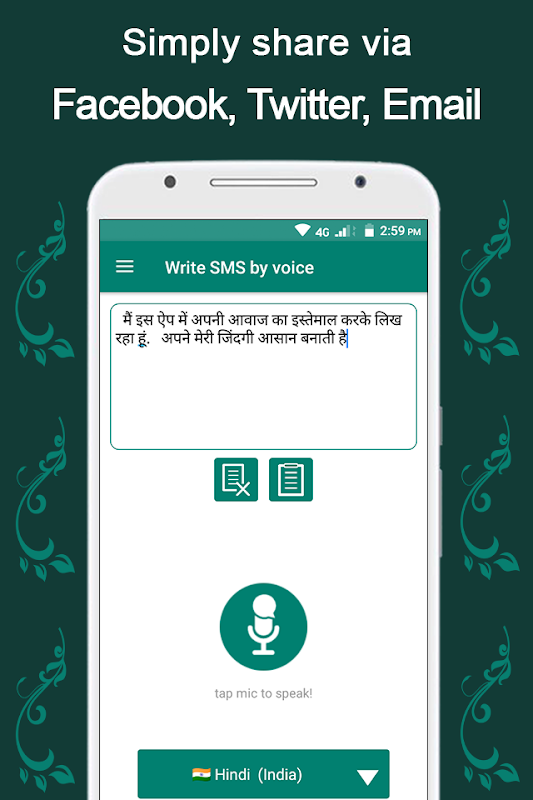 Después de recibir su SMS en forma de texto, lo copia. Puede compartir su SMS o texto a través de WhatsApp, messenger, imo, twitter, correo electrónico y Facebook. En la aplicación "escriba SMS por voz", hay más de cien idiomas disponibles en todo el mundo, que se hablan en diferentes países del mundo. Sólo tienes que elegir el idioma requerido y hablar. Su voz se convertirá automáticamente al idioma elegido en la aplicación "escribir SMS por voz".