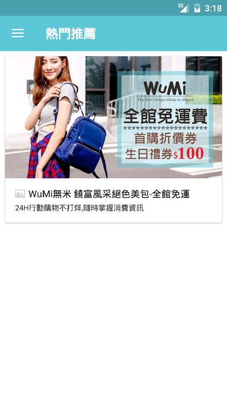 請跟著我們的腳步走進WuMi的APP世界,輕鬆快速隨時了解最新訊息&第一手優惠,WuMi不但製作出時尚包款,更追求精緻的質感,我們堅信每款包包都是品牌的象徵,讓每位擁有WuMi的女孩生活加點姿彩,垂手可得的時尚美包品牌,請妳停下腳步欣賞WuMi帶給妳的視覺感官。