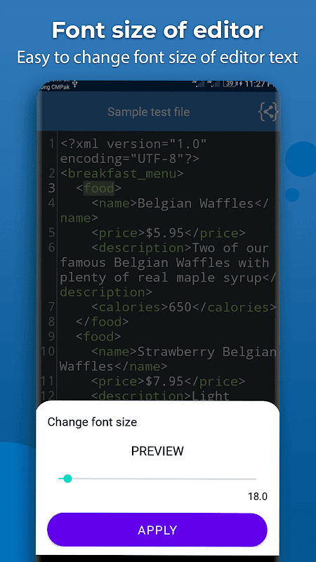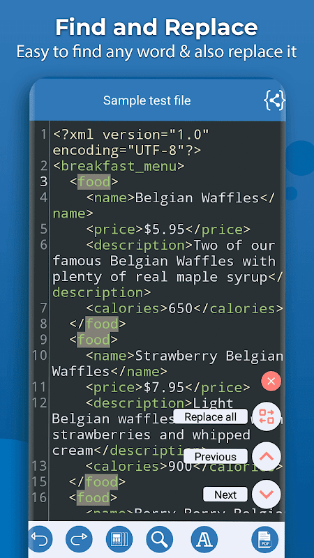 A través del editor xml, puede deshacer y rehacer el código fácilmente y puede navegar fácilmente a un número de línea específico. En el editor xml puede buscar fácilmente cualquier palabra y también reemplazar fácilmente todos los resultados de búsqueda con cualquier otra palabra. Xml Viewer tiene un tema diferente que puede aplicar fácilmente al editor. En la aplicación xml reader, puede cambiar fácilmente el tamaño de fuente del editor.