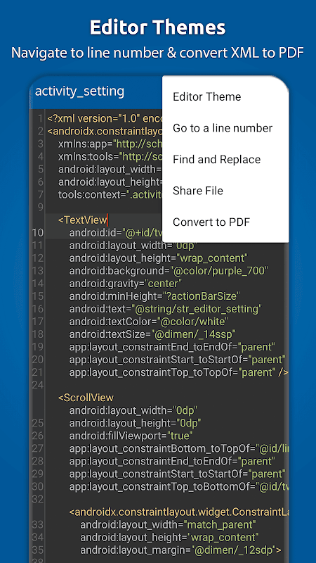 Escriba mejor código XML sin sudar. XML Viewer y XML editor es una herramienta avanzada, sofisticada y robusta para todas sus necesidades de edición de XML. XML Reader tiene características únicas como deshacer y rehacer, navegación de línea, resaltado de sintaxis, codificación de colores y más para brindarle la mejor experiencia mientras escribe código.
