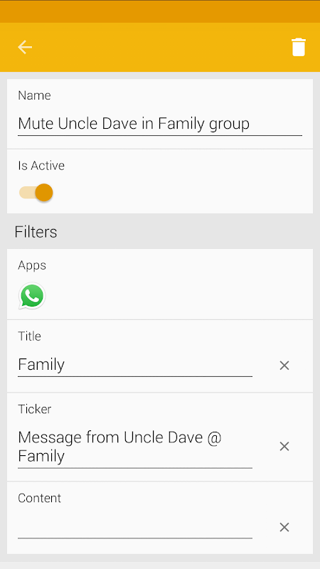 Lets you create rule based on any combination of: Notifying app, notification title, notification ticker and notification text.