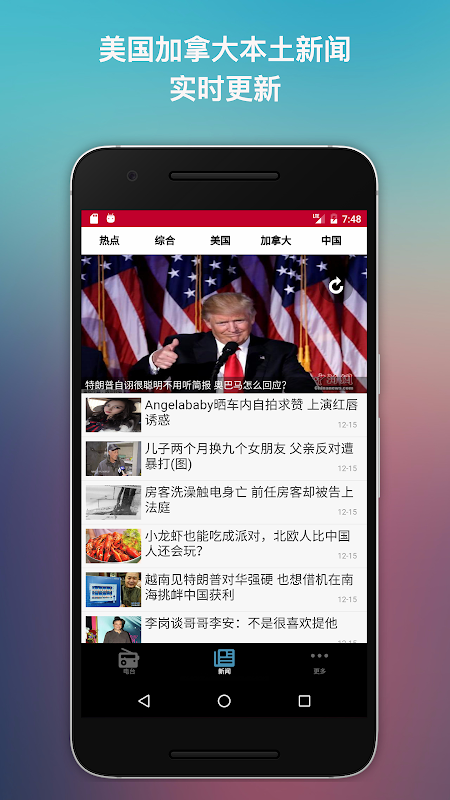 《美国加拿大中文收音机》收集了几乎所有美国加拿大各地中文电台(国语、粤语), 7天24小时不间断更新世界各地新闻