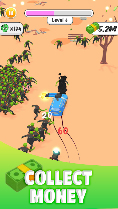 ¡Zombies que vienen de todas partes, y estás en tu máquina de matar! Conduce libremente y mátalos a todos, recoge tus recompensas y mejora. ¡Los zombis aumentarán en número, también lo harán tus habilidades para vencerlos! Puedes matarlos desde lejos o conducir directamente hacia ellos y verlos romperse en pedazos. ¡Diviértete!